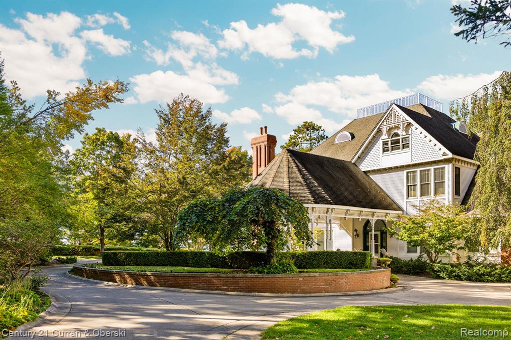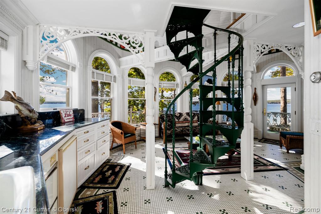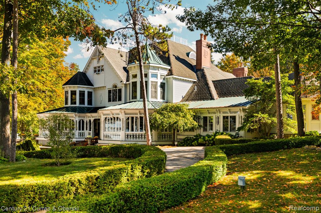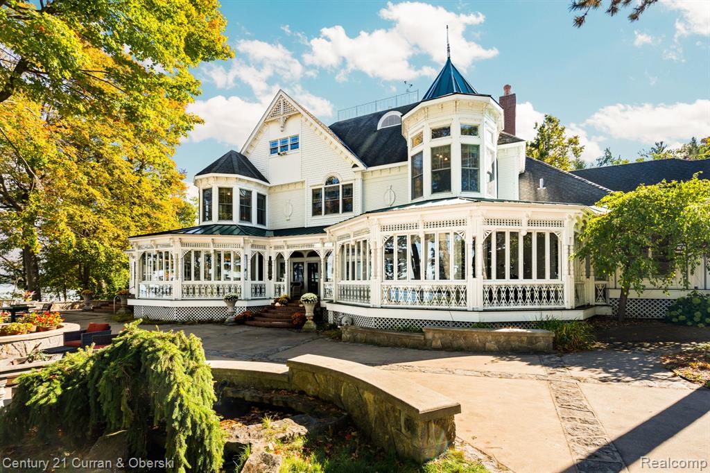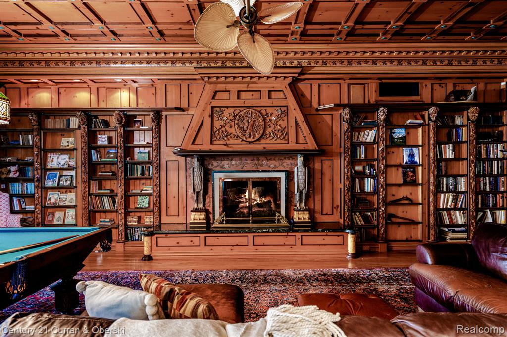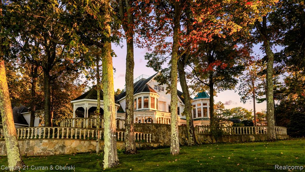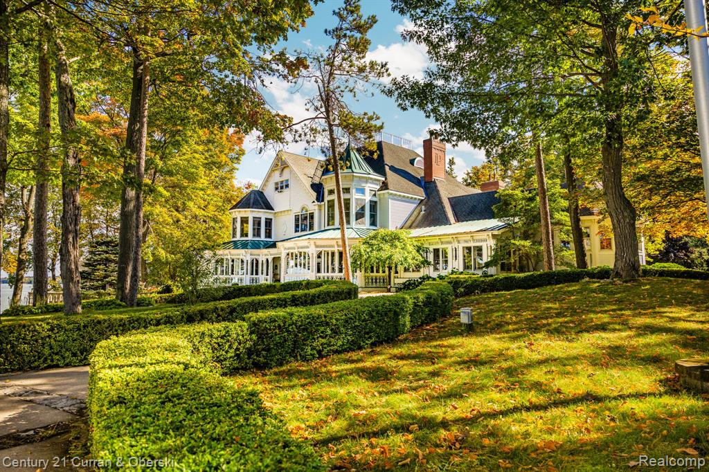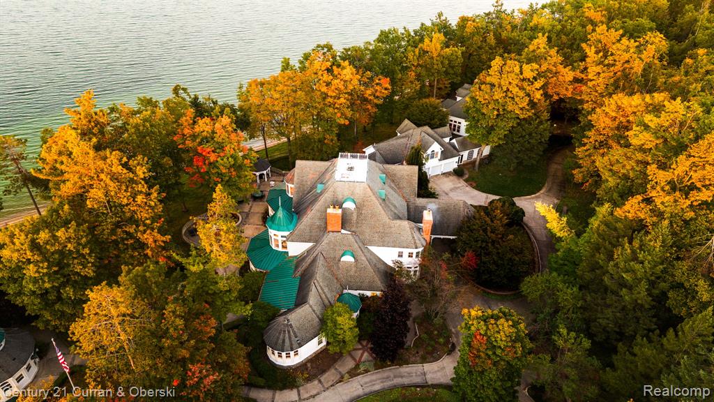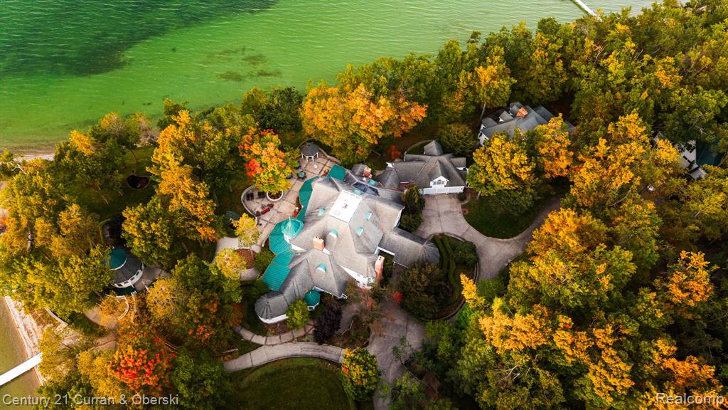 As soon as the gate opens, the quarter-mile driveway leads you into a place so enchanted, some don’t even believe it. Tucked within 14.1 private wooded acres and surrounded by 1,500+ feet of direct Mullett Lake frontage, Red Pine Point stands among Northern Michigan’s most remarkable lakefront estates. The Victorian-inspired main residence offers 15,970 sq. ft. of living space and over 18,000 total finished sq. ft., including in-law and caretaker quarters, multiple garages, and a lakeside gazebo. Built with exceptional craftsmanship, the home features hand-carved millwork, rare Bird’s-eye maple paneling, coffered ceilings, marble fireplaces, and tin-inlaid details. The 1,400-sq. ft. great room centers on a marble fireplace flanked by hand-carved Caryatids with panoramic lake views. A chef’s-grade kitchen offers commercial appliances, dual islands, a walk in pantry and custom cabinetry adjoining both formal and casual dining areas. Additional highlights include an exquisite Library and billiards room, a media room, and wet bar with marble counters and nostalgic ice-cream parlor. The home provides 10 bedrooms and 13 baths, including a primary suite with private veranda, office, and spa-style bath. Structural features include radiant in-floor heat in various places of the home, heated quarter-mile driveway and walkways, attached four-car garage, and multiple auxiliary garages. Outdoor amenities feature stone terraces with balustrades, 131-ft veranda, 75-ft covered lakeside porch, multiple fire pits, manicured walking paths, and a lakeside gazebo with full bath, sitting area, spiral loft, and outdoor hearth. Located along Michigan’s Inland Waterway with boat access to Lake Huron and Mackinac , Red Pine Point offers extraordinary craftsmanship, privacy, and accessibility.